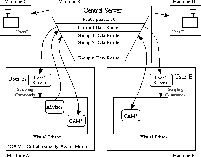 In addition to maintaining the list of participants the central server is also responsible for maintaining a list of current groups and distributing data between group members. The server distinguishes the sending module by means of its local server ID and then duplicates and distributes the incoming data object to all other group members. Group members are held in a list and should two group members send data at the same time the central server propagates the data from the first member in the list and disposes of data from the second. This is done to prevent groups getting out of synchronisation. When the number of group members falls to zero the central server deletes the group from the list.