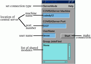 The job of the local server is twofold; to establish the collaborative session by connecting to the central server, subsequently providing CAMs with this connection information; and to provide a channel for the central server to issue Skm commands to either launch new CAMs or establish pipeline fragments as directed by an Advisor module (see Section 1.2.4). Once launched the user enters the machine name and port number of the central server and then hits the Start button (the IRIS Explorer environment defines suitable defaults which are used by the module when it is started up). The local server can connect to the central server in one of two modes: