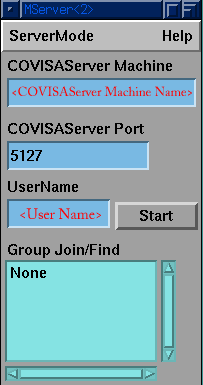 When the module is launched a number of fields may need to be completed or altered (see Figure 4-2). First check that the slot marked COVISAServer Machine contains the name of the machine running the COVISA Server as set in Section 4.1. Check the slot marked UserName to ensure it contains the name you wish to use in the session. It is best to choose a unique name for the session to aid identification. Check that the slot marked COVISAServer Port contains the port number that the COVISA Server is using. This value is set to a default of 5127 at installation time so it probably will not need to be altered. The default server mode is On-The-Fly, this is the mode that you should be using for this type of session. Finally, press the button marked Start to connect to the collaborative session. Once the MServer module has made the connection to the COVISA Server, the COVISAServer Machine, COVISAServer Port, UserName and Start widgets will disappear, and a new widget called Conference List will take their place. In this widget will appear your own username and the names of all the other collaborators in the current session. The Group Join/Find widget will remain empty.