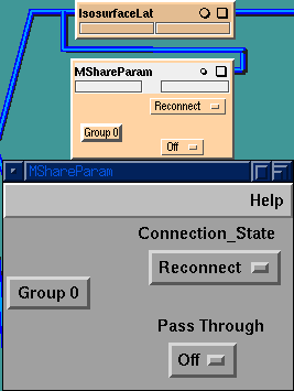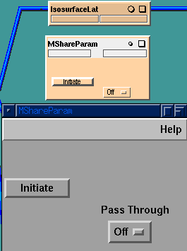 Any of the other widgets on the IsosurfaceLat module may be similarly shared using this process. Care should be taken that the widgets of all the IsosurfaceLat modules are connected to corresponding MShareParam port numbers. E.g. the widget Smooth? uses input and output ports 2, Flip Normal? uses input and output ports 3, etc., etc.