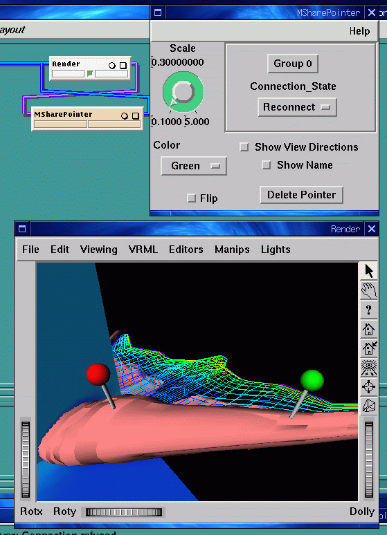Set the Render module into the appropriate picking mode (see Section 2.7.1.1) and then click on an object in the scene. The MSharePointer module will create a pointer shaped geometric object and place it at that point in the scene, as well as sending this pointer to the other connected MSharePointer modules. This means that you are able to place a pointer object at the same position in the rendered scene of all collaborators, hence allowing the collaborating group to identify specific points of interest. Now ask one of your collaborators to click a different point in the scene and watch as a new pointer object appears.