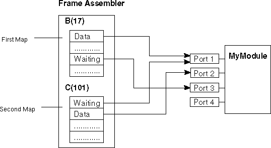 Figure A-5 shows a snapshot of the firing process. It illustrates the frame assembler after it has received Port 1 data from B and Port 2 data from C. Each frame has a slot for each port, with these three possible states: