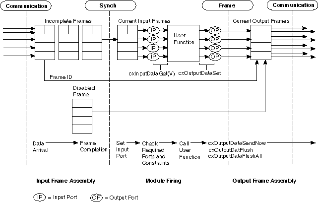A disabled module handles new frames by merging them onto the input ports, then sending a NULL (synchronization) frame downstream; the user function is not called. When the module is enabled, if there is an unused partial frame merged into the input ports, then the user function is called.