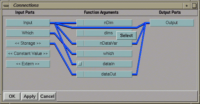 When you click Select, a blue wire links the input port with the function argument.