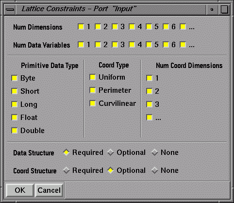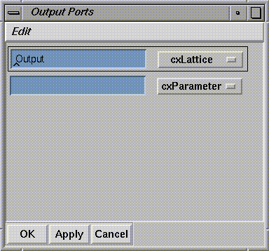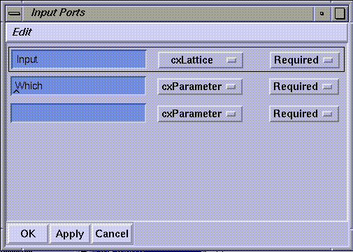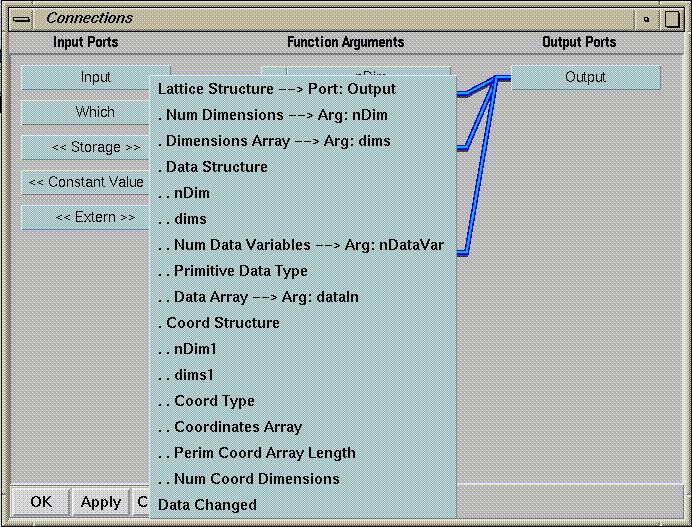 To connect an input port to a function argument or output port, click with the right mouse button on the input port name bar. A popup menu appears, listing the data structures associated with the port. For example, the input port Input accepts lattice data, and its popup menu (see Figure 1-11) lists the lattice substructures. They contain data arriving on the module's input port from upstream. The connections you make from the data structures on the input ports to the function arguments determine which data are recognized and processed, and which data are ignored.