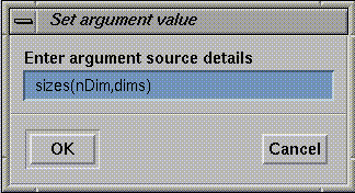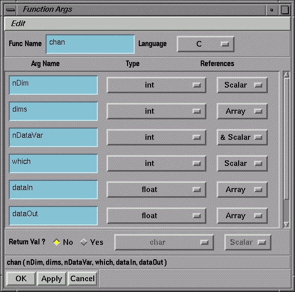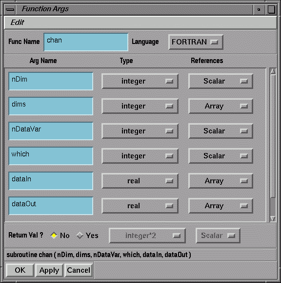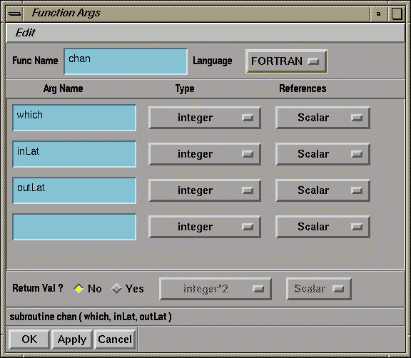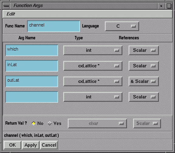 Figure 1-21 and Figure 1-22 show the Function Args Window for the C and Fortran versions of the module. In C, the input and output lattices are both typed as cxLattice*, with the input lattice being passed as a Scalar, and the output lattice as a &Scalar (i.e., the address of a scalar). In Fortran, both lattices are typed as an integer and passed as a Scalar. The close correspondence between the definitions in the window and those on the function call line can clearly be seen.