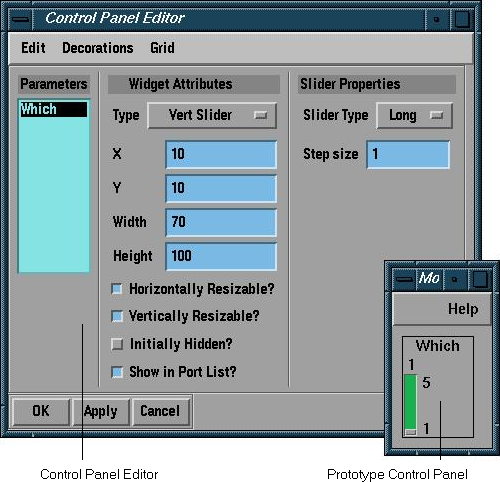 All input ports of type cxParameter appear in the Parameters list in the Control Panel Editor. By default, new parameters have no widget associated with them. You can change this via the Type option menu. For example, to set the widget for the Which parameter port to another kind, click the left mouse button on it to select it, then click the Type option menu under Widget Attributes. You can select any widget type that is not grayed out. In Figure 1-16 the widget has been set to a vertical slider.