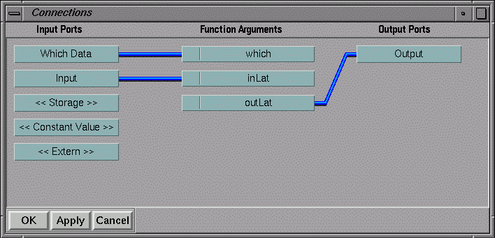 The Connections Window is the same for both C and Fortran versions of the module. The Lattice Structure component of the Input port is connected directly to inLat, and outLat is connected directly to the Lattice Structure component of the Output port. Because the output lattice is created inside the module (via a call to the cxLatNew API function) there is no need to use the <<Storage>> pseudo input port together with an internal function to calculate its size, as was required in the example module.