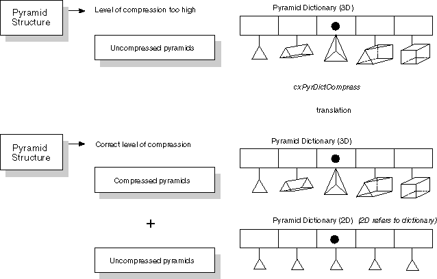 A pyramid that incorporates a pyramid dictionary is said to be a compressed pyramid as opposed to the uncompressed pyramids lacking such a dictionary. A pyramid dictionary is simply a collection of uncompressed pyramids that describe in full detail their reference elements.