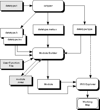 For a new data type to work in IRIS Explorer, it must have a C structure definition that can be used to build modules, as well as a description of the type that IRIS Explorer and the Module Builder can load at run-time. It is also useful to have a library of accessor functions that allow C, C++, and Fortran users access to the type with a minimum of programming. IRIS Explorer allows you to create all these things.