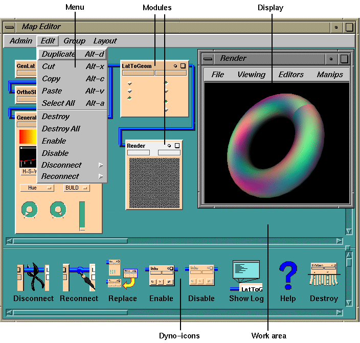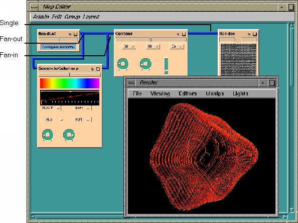 In the Map Editor, you create an IRIS Explorer map. A map is a collection of modules of different kinds, connected in sequence, which process numerical data to accomplish a task. A module is a processing unit in a map. Each module accepts data, acts on it, and sends the result to the next module downstream. The Map Editor is the environment in which maps are created and executed, or fired.