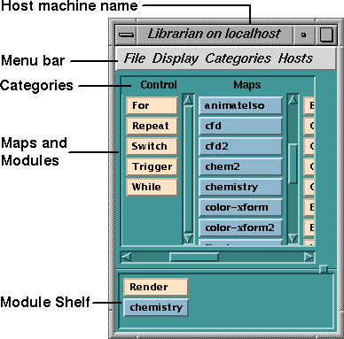 The Module Librarian (see Figure 2-2) is a file browser and selector that provides access to IRIS Explorer modules and maps through its scrolling columns and Librarian shelf.