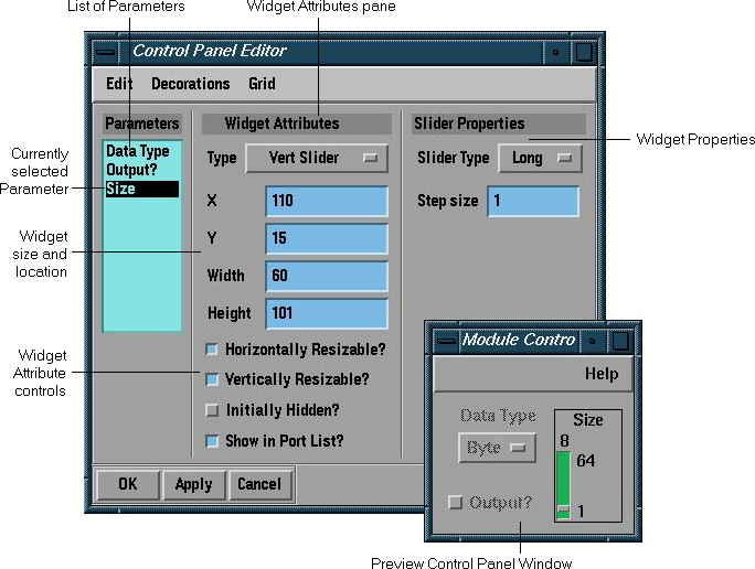 The Control Panel Editor (see Figure 4-1) lets you modify a module control panel or create a new one by editing the parameter widgets and menu items. You may change a widget's type, position and resize them, and change their limits and default values.