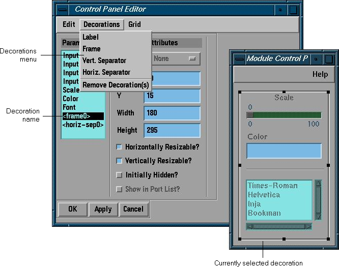 Figure 4-3 shows a selection of widgets, as well as the control panel decorations. Decorations are vertical and horizontal separator lines, frames and labels, available from the Decorations menu (see Figure 4-4). You can size them and move them around in the same way as you manipulate widgets.