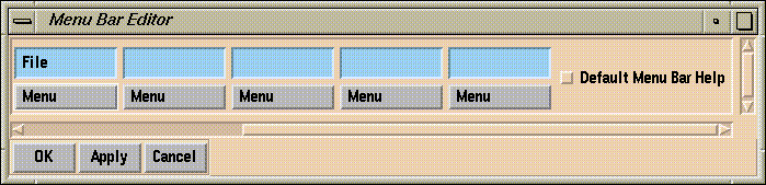Set up your menus by typing the name of each menu in the text slots in the Menu Bar Editor, for example, File. To save them, click on Apply.
