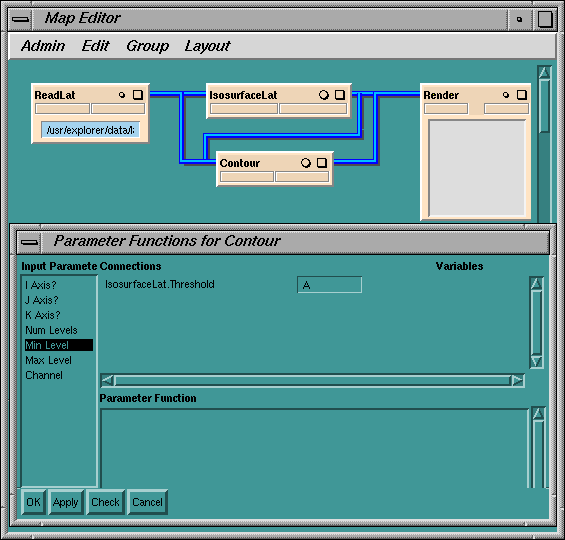 From now on, when you turn Contour's Min Level and Max Level dials, the Map Editor sends these values to IRIS Explorer's parameter interpreter. It evaluates the expression and feeds the result to IsosurfaceLat's Threshold parameter.