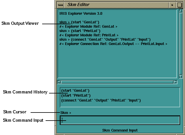 All output from Skm is directed here, including the commands you type and the Skm cursor. One of the main advantages of using IRIS Explorer in this mode is that Skm output is separated from general IRIS Explorer standard output, for instance from modules. This makes it easier to keep track of what you have typed in Skm.