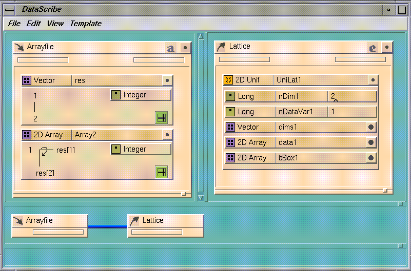 You associate items in the input template (ArrayFile) with their counterparts in the output template (Lattice) by wiring them together, just as in the Map Editor. You can use the ports on the templates themselves, or on the overview templates. The wires appear only on the overview templates (see Figure 7-11).