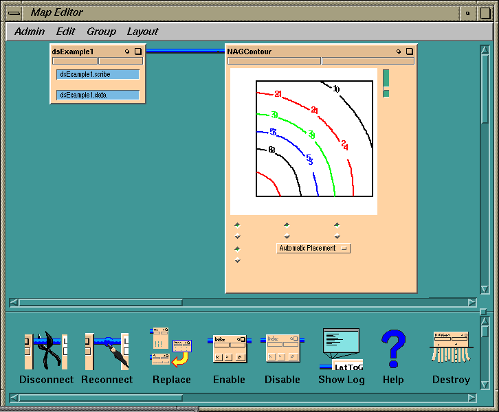 The final step in building the module is to pass the module resource file to the Module Builder (see IRIS Explorer Module Writer's Guide (UNIX)) to lay out the control panel and perform the build. We use the Control Panel Editor (see Section 4.2) to attach widgets to our input parameter ports and to place them on the module control panel. No other functions need to be performed in the Module builder, since QuickLat has filled in all other details of the module in its resource file. Finally, we build the module, and use it within the Map Editor.