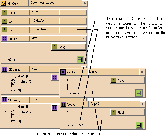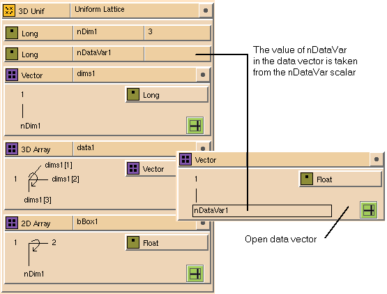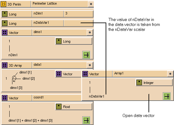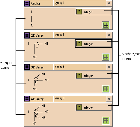 You can replace the node type with a scalar, array, or set glyph. For example, each array in Figure 7-7 has a different node type. If you drop an array or set glyph onto the node type icon, you can construct a data hierarchy. For example, if you open the vector glyph in the 4-D Array glyph in Figure 7-7, you see the nested vector structure (see Figure 7-9), which must in turn be defined. The new data structure consists of a 4D array, where a vector exists at each node. For more information, see Section 7.1.7.4.1.