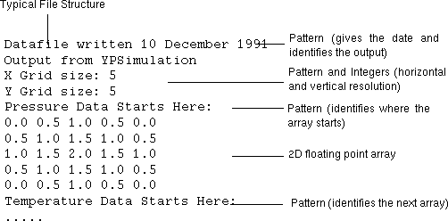 To illustrate, suppose the user is to read into IRIS Explorer a data file which contains a two-dimensional array of values along with details of the regular grid on which the data values are arranged. The file has the following contents:
