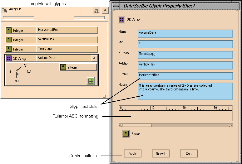 To change the data type for a template once it has been defined, or to make notes about a template, select the template by clicking on its arrow glyph. Then select Properties from the Edit menu and use the Glyph Property Sheet (see Section 7.1.8.1) to make changes.