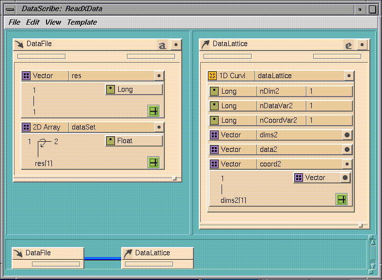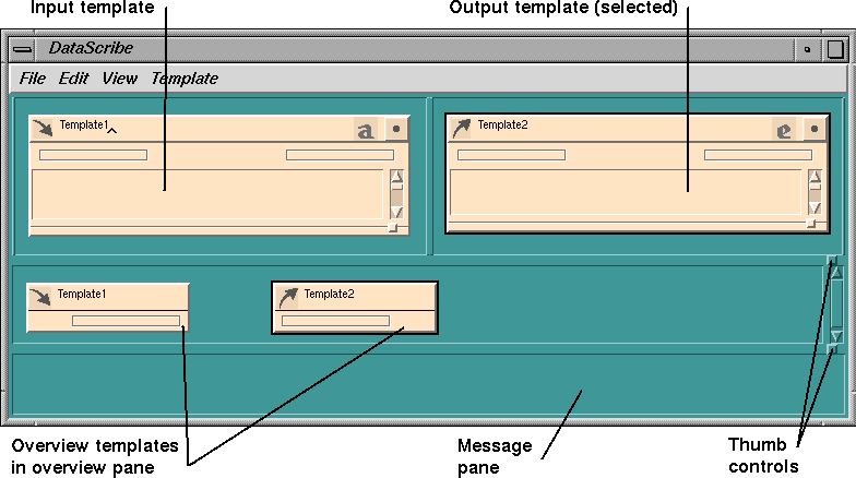 The DataScribe window is the work area in which you assemble templates to create a data conversion script. The templates may contain data glyphs, parameters, or constants; the overview pane of the DataScribe window shows the wiring scheme that defines the rules for data conversion in each script.
