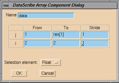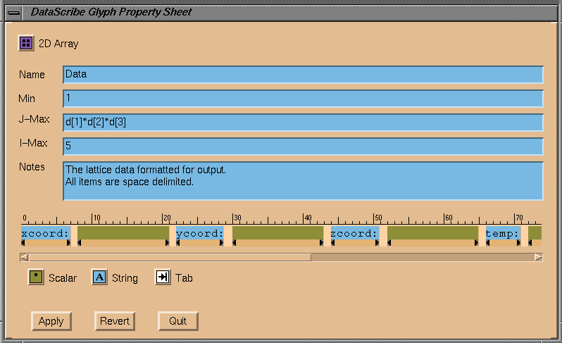 The DataScribe can only act on data arranged in ordered matrices or arrays, including the IRIS Explorer lattice data type. The modules that it creates can have parameter inputs (see Section 7.1.9.1) whose values can be controlled from the module control panel. However, it does not handle: