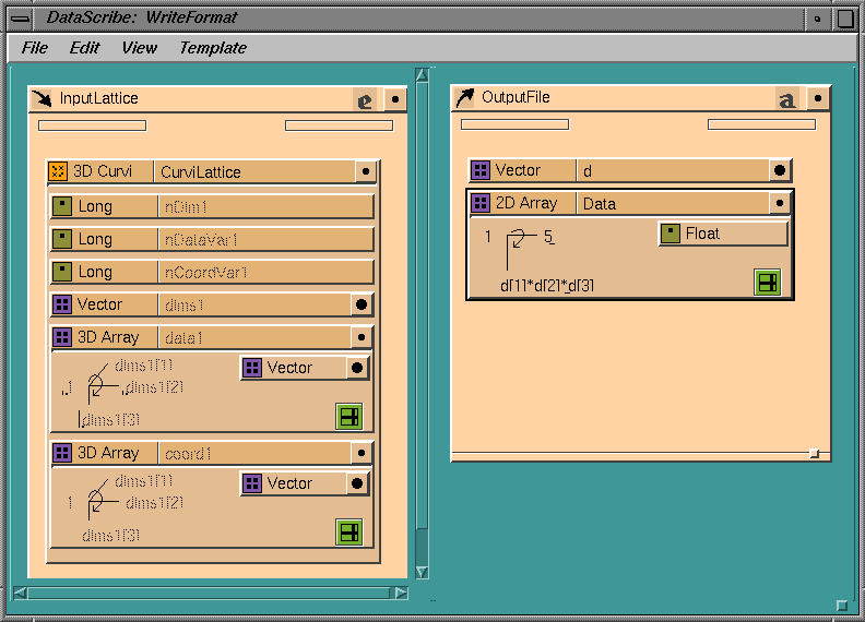 The script is a file consisting of input and output templates and their wiring. The templates contain information, in the form of glyphs, about the data types that you want to convert. Glyphs are icons that represent each data type and its components in visual form. The wiring connections map an input data type to its output data type. For example, you may have arrays in an ASCII file that you want to bring into IRIS Explorer. The glyphs in the input template represent the type of array you have (such as 2D or 3D), and those in the output template indicate how you want your array data to appear in IRIS Explorer. For example, you can select a small, interesting section from a large and otherwise uninteresting array by connecting input and output glyphs so that only the data you want is converted into the IRIS Explorer lattice.