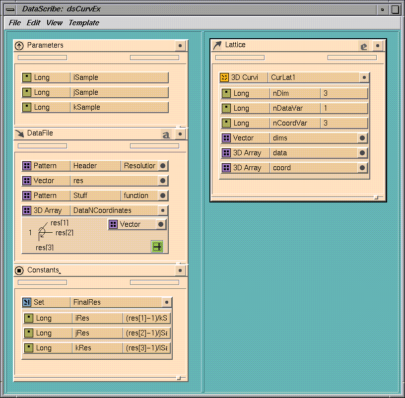 The DataScribe is a utility for converting ASCII and binary data into and out of the IRIS Explorer lattice data type. ASCII data must be in the form of scalars and/or arrays. A scalar is a single data item, and an array is a structured matrix of points forming a lattice. You can convert data into and out of IRIS Explorer lattice format by building a data conversion script in the DataScribe.