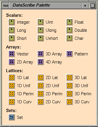 The DataScribe Data Type palette (see Figure 7-5) displays the data types available for data transforms in IRIS Explorer. Data types are arranged in the palette in order of complexity and are identified by color-coded icons, called glyphs, which are organized into scalars, arrays, lattices, and sets.