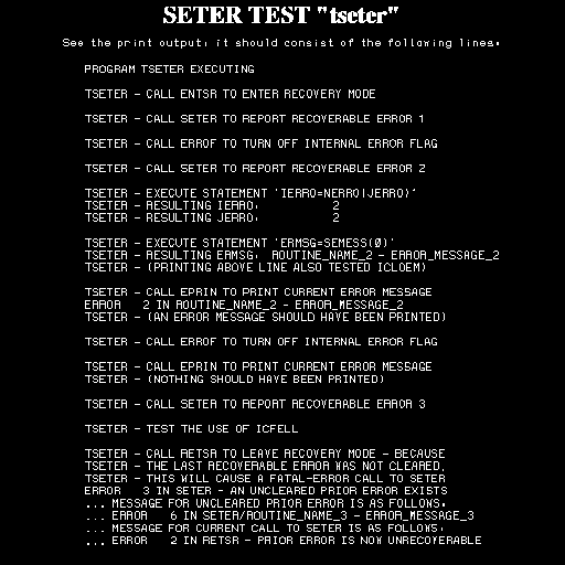 error), SETER prints the error message MESSG, calls FDUM, and STOPs.